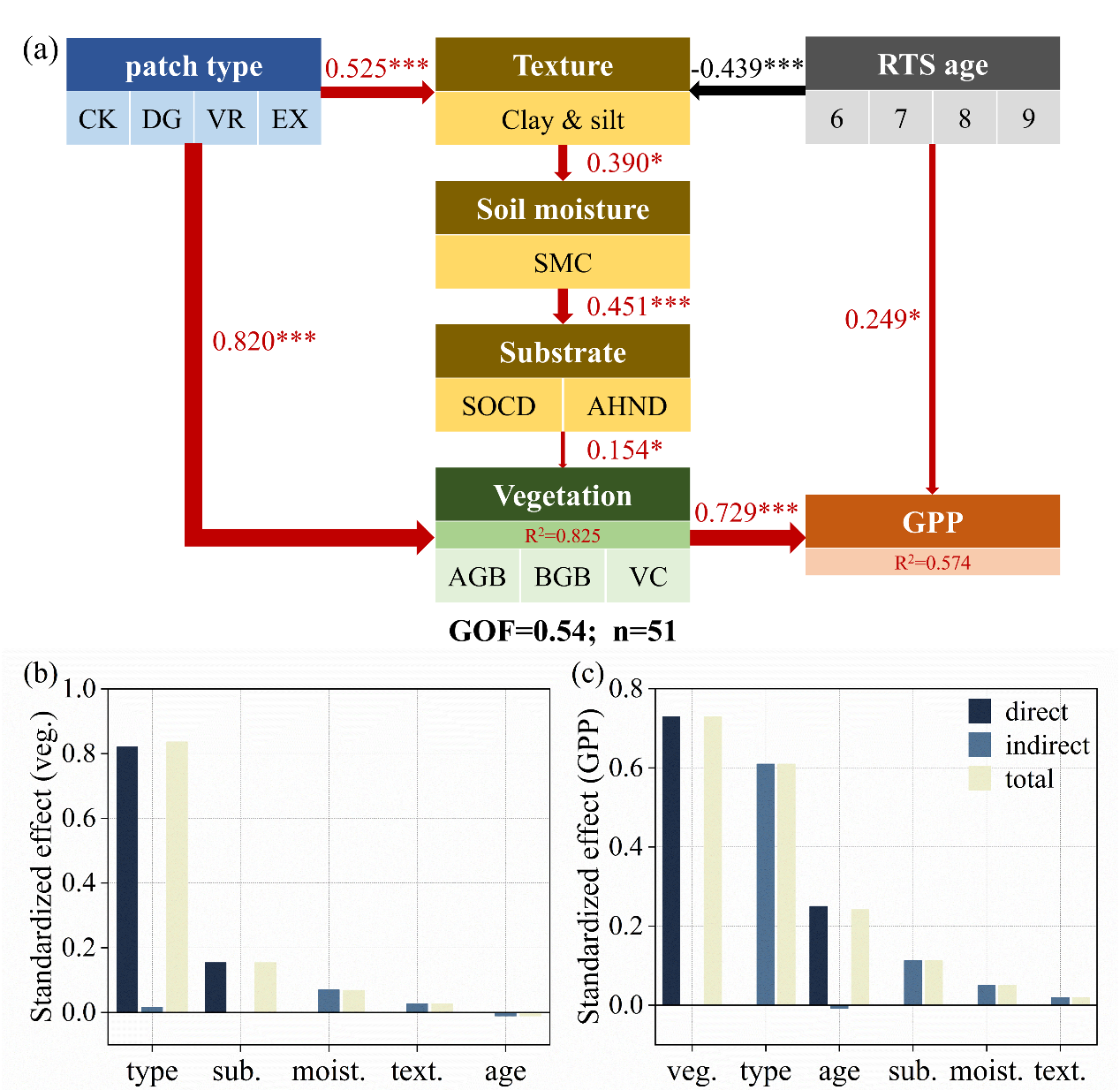 偏最小二乘路徑模型結(jié)果表明,熱融滑塌主要通過“土壤質(zhì)地-水分-基質(zhì)-植被-GPP”路徑影響青藏高原生態(tài)系統(tǒng)功能。其中植被對GPP的直接控制最強(qiáng),滑塌年齡次之,土壤過程則更多通過調(diào)節(jié)群落結(jié)構(gòu)間接作用影響GPP。因此,在評(píng)估熱喀斯特地貌的碳效應(yīng)時(shí),應(yīng)將滑塌地表類型及年齡組成納入考量。