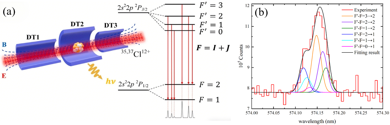 由于高電荷態(tài)離子制備條件苛刻、多電子體系能級(jí)結(jié)構(gòu)復(fù)雜,對(duì)其開(kāi)展高精度實(shí)驗(yàn)測(cè)量長(zhǎng)期面臨較大的技術(shù)挑戰(zhàn)。研究團(tuán)隊(duì)依托高溫超導(dǎo)電子束離子阱(EBIT)實(shí)驗(yàn)平臺(tái),首次成功觀測(cè)到類(lèi)硼氯離子(Cl12+) 中2P1/2和 2P3/2能級(jí)的超精細(xì)分裂結(jié)構(gòu),并通過(guò)高分辨譜線(xiàn)擬合獲得了相應(yīng)的超精細(xì)結(jié)構(gòu)常數(shù),利用第一性原理理論計(jì)算,成功提取該離子原子核的磁偶極和電四極超精細(xì)結(jié)構(gòu)常數(shù)。該工作為中等原子序數(shù)高電荷態(tài)離子超精細(xì)結(jié)構(gòu)的理論研究提供了重要實(shí)驗(yàn)基準(zhǔn)。
