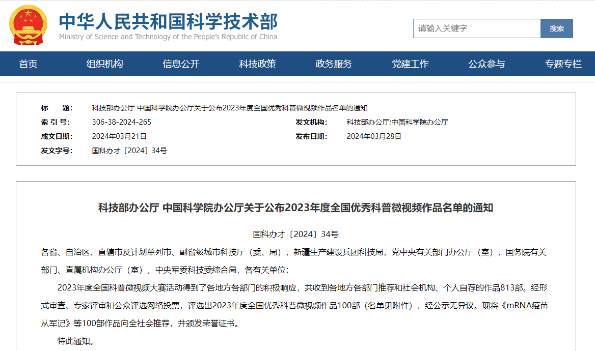 據(jù)悉,2023年度全國科普微視頻大賽共收到各地方各部門推薦和社會(huì)機(jī)構(gòu)、個(gè)人自薦的作品813部,經(jīng)形式審查、專家評(píng)審和公眾評(píng)選網(wǎng)絡(luò)投票,評(píng)選出2023年度全國優(yōu)秀科普微視頻作品100部。