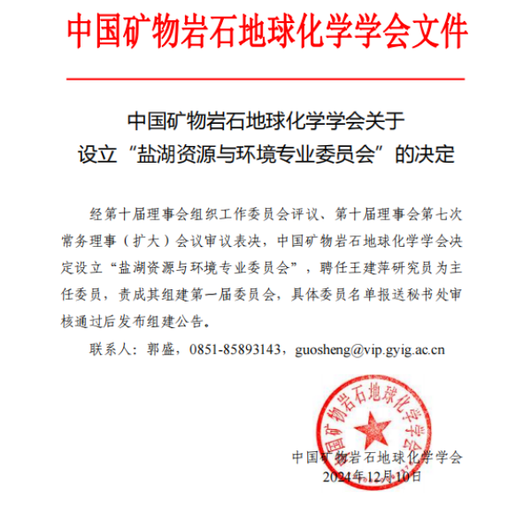 青海鹽湖所牽頭申報(bào)鹽湖資源與環(huán)境專業(yè)委員會(huì)獲中國(guó)礦物巖石地球化學(xué)學(xué)會(huì)批準(zhǔn)設(shè)立