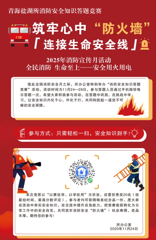 為切實(shí)筑牢消防安全防線,提升全員消防安全意識(shí)和應(yīng)急處置能力,在全國消防月期間,中國科學(xué)院青海鹽湖研究所創(chuàng)新消防安全教育形式,于11月24日至28日組織開展了線上消防安全知識(shí)競(jìng)答活動(dòng),全所100余名職工及學(xué)生通過掃描二維碼參與活動(dòng),以賽促學(xué)、以學(xué)促用,營造了濃厚的消防安全學(xué)習(xí)氛圍。