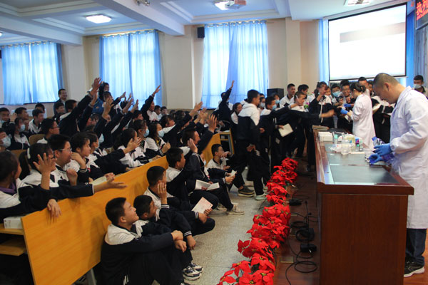 在校園,青海鹽湖所的博士科普團(tuán)隊(duì)為中學(xué)生們講述了鹽湖故事,在《中國的鹽湖》科普講座中,形象生動地講述了“什么是鹽湖”“鹽湖在哪里”“鹽湖里有什么用”,使同學(xué)們對青海的特色優(yōu)勢鹽湖資源有了初步的認(rèn)識;開展了神奇的化學(xué)小實(shí)驗(yàn),通過多彩化學(xué)、密碼顯形、黃金雨、催化放氧、銅樹銀枝、銀鏡反應(yīng)等一系列精彩的科普實(shí)驗(yàn),緊緊抓住“變化”這一核心,以極具震撼力的方式向同學(xué)們展示了化學(xué)之美和科學(xué)之美,為同學(xué)們開啟科學(xué)世界的大門,激起他們探索科學(xué)世界的興趣;醫(yī)療專家為同學(xué)們現(xiàn)場普及家庭急救知識和新冠疫情預(yù)防知識,現(xiàn)場演示了心肺復(fù)蘇方法、正確的洗手方法及注意事項(xiàng)。無論是小實(shí)驗(yàn)還是急救現(xiàn)場演示,同學(xué)們踴躍主動,興致勃勃,教室里不時發(fā)出陣陣驚嘆聲和掌聲,活動取得了圓滿成功。