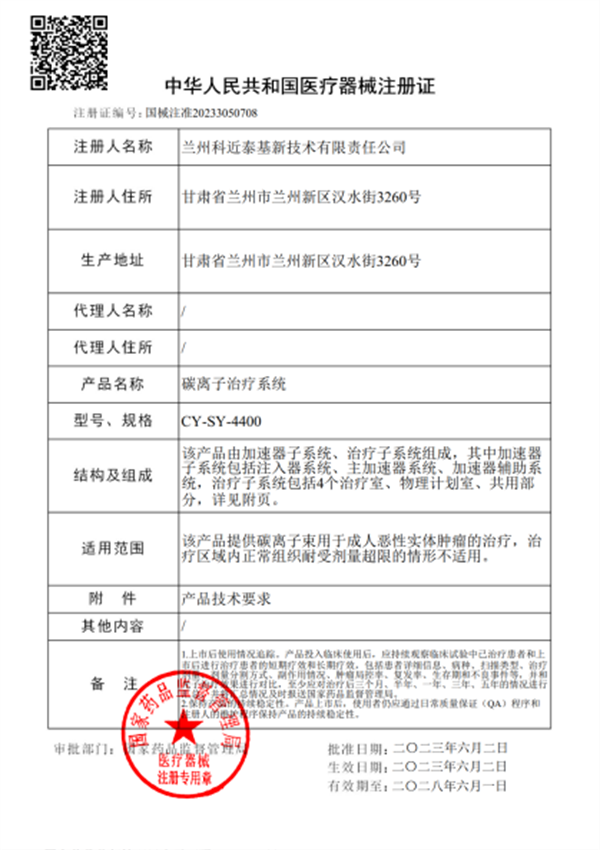 蘭州碳離子治療系統(tǒng)獲批注冊