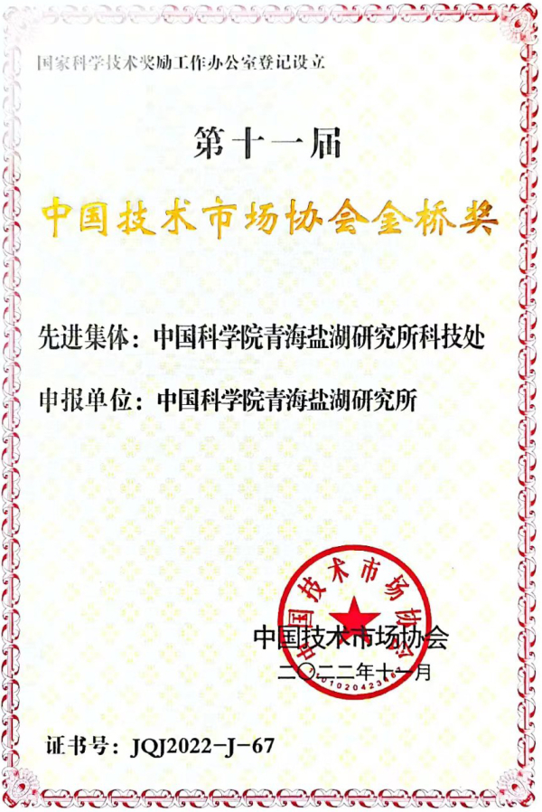 青海鹽湖所獲第十一屆中國技術(shù)市場協(xié)會(huì)金橋獎(jiǎng)獎(jiǎng)勵(lì)大會(huì)表彰