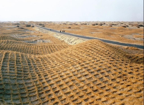 實(shí)際上,草方格最早應(yīng)用于我國(guó)第一條沙漠鐵路包蘭鐵路的建設(shè)中。在寧夏沙坡頭地區(qū)火車穿越了騰格里沙漠,在科技工作者和當(dāng)?shù)厝罕姷墓餐ο?,麥草方格編成的巨網(wǎng)最終成功縛住了“沙龍”。沙坡頭因此被稱為“草方格的故鄉(xiāng)”。如今,一把鐵鍬,一捆麥草,一片草方格,沙坡頭實(shí)現(xiàn)了黃沙變綠洲的嬗變,騰格里沙漠中神奇地出現(xiàn)了一條連綿延伸的“綠帶”。