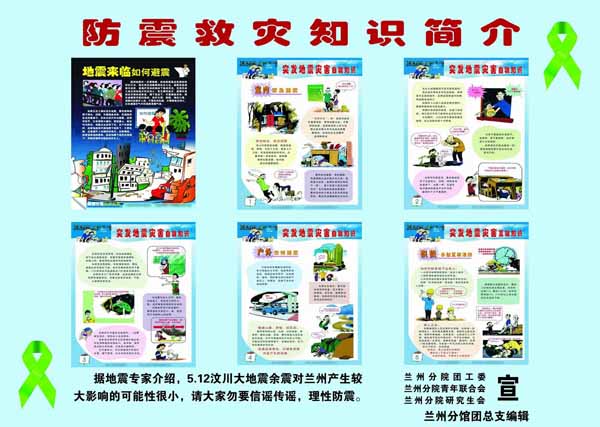 為正確引導(dǎo)廣大團(tuán)員青年堅定信心,沉著應(yīng)對地震災(zāi)害,防止地震謠言的傳播和擴(kuò)散,維護(hù)良好的社會秩序和有序的工作環(huán)境,蘭州分院團(tuán)工委會同蘭州分院青年聯(lián)合會、研究生會迅速組織力量編輯制作了《中國科學(xué)院蘭州分院防震抗震知識讀本》和“防震救災(zāi)知識簡介”宣傳畫,并在蘭州分院各單位分發(fā)、宣傳,特別是在科學(xué)院中學(xué)和小學(xué)大范圍發(fā)放和張貼,有效加強(qiáng)了中小學(xué)生的防震抗震知識和緊急逃生救護(hù)常識,受到有關(guān)方面的歡迎,取得了良好的社會效益。