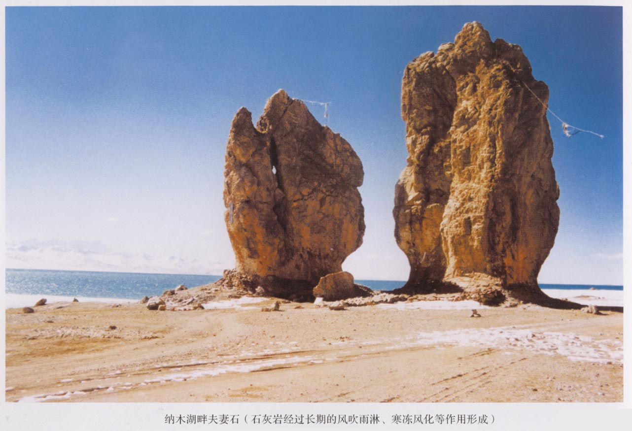 青藏高原石灰?guī)r的分布面積約20萬平方公里,大自然的神工鬼斧雕塑了奇形怪狀的巖溶形態(tài)。位于高原東緣的龍、九寨溝是石灰?guī)r溶蝕和碳酸鈣沉積形成的巖溶景色的代表,在高原腹地的唐古拉山山坡安多山上有巖溶洞、巖溶峰和其它奇形怪狀的巖溶地貌。在西藏昌都附近的大喇嘛山下有一排似長城?樣的峰林墻組合。在阿里地區(qū)的班公湖畔有許多峰林溶洞,是鳥類棲息的最佳天然場所,形成了藍(lán)天、白云、鳥飛、魚躍、湖靜、岸奇的人間仙 境。在青藏公路沿線的雁石坪溫泉一帶也分布著由泉華堆積形成的泉華錐和石灰?guī)r造型。